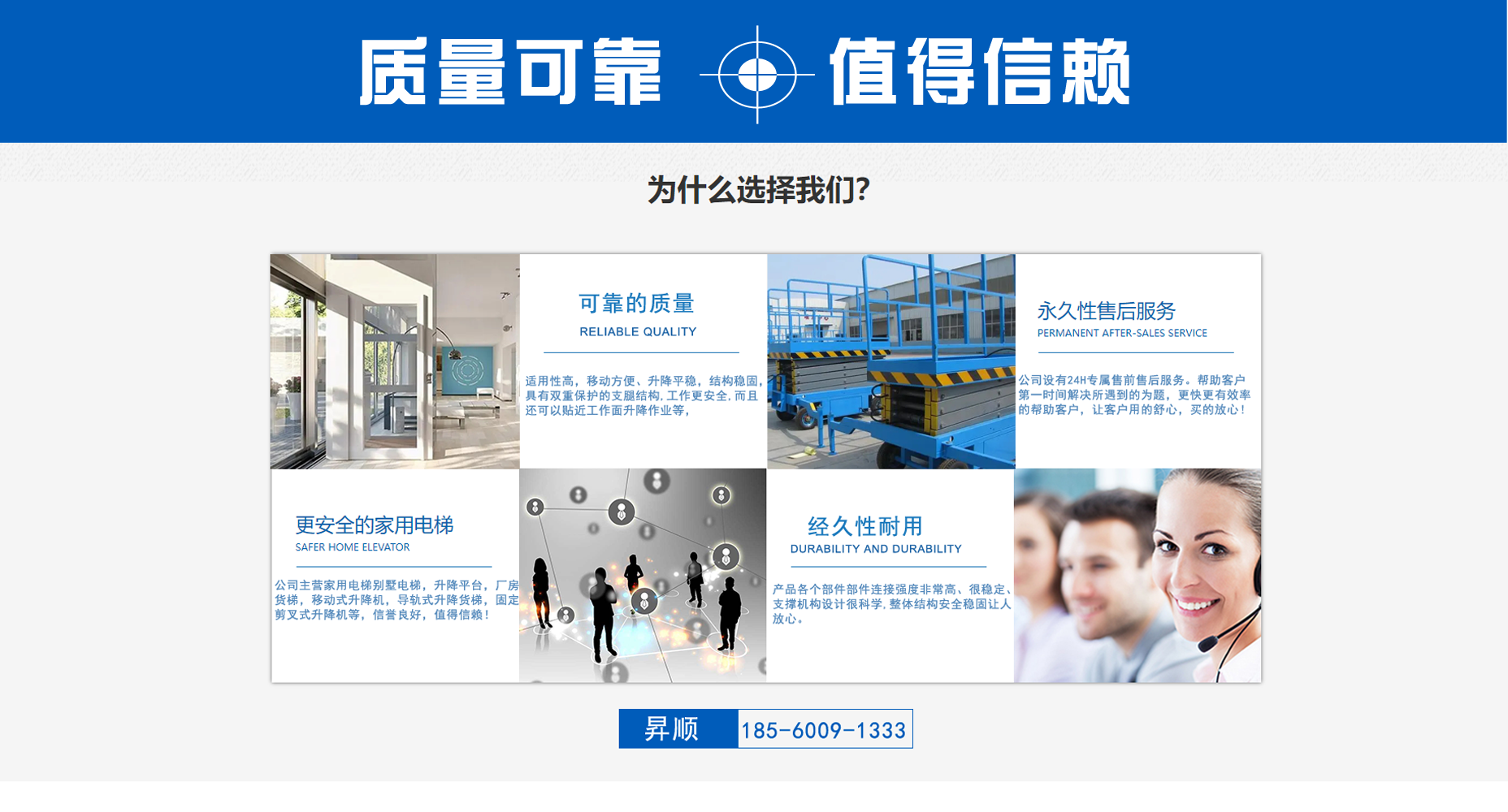 山東昇順液壓升降機械有限公司是一家主營家用電梯,別墅電梯,升降平臺,廠房貨梯,移動式升降機,導軌式升降貨梯,固定剪叉式升降機等產品企業,質量可靠,值得信賴?! ∮脩糁辽?,以用戶為中心”是公司永遠堅持的服務宗旨,贏得用戶的贊許是我們的榮譽,及時滿足用戶的需求,是我們公司的愿望。長期以來,公司員工以優質的服務,取悅于用戶,以誠信的言行取信于用戶,得到了用戶們的好評。我們期待著與您更加愉快的合作!公司的發展,離不開社會的大力支持,在社會的支持和幫助下,我們正昂首闊步邁向未來! 我們的經營方針是:以質量求生存,以產品求發展,以信譽保合作,以服務贏客戶。 本公司對產品質量和各項服務恪守合同承諾,并愿與新老客戶精誠合作,共創未來?! 」揪瘢簞撔率侵黝},超越是不懈的追求?! 」咀谥迹盒抛u保證,誠信為本?! ∥覀儠院侠淼膬r格,良好的信譽,雄厚的實力,優質的產品,最周到的服務,服務于廣大新老客戶!...